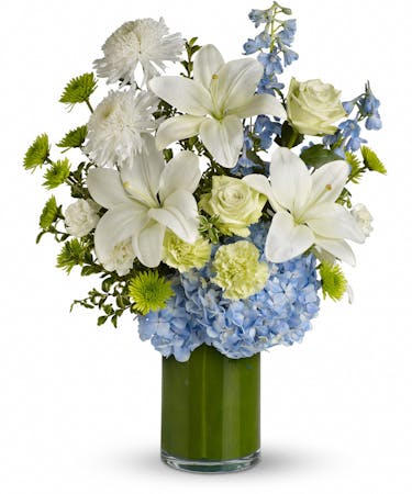 Cool as an ocean breeze, this beautifully serene bouquet features green roses, white lilies, and blue hydrangea in a stunning leaf-wrapped cylinder vase. It's like a vacation for the eyes and they'll adore it.